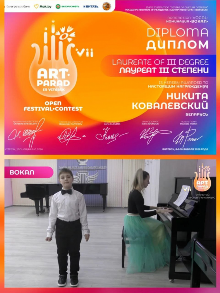 Дипломом лауреата III степени в номинации «Академический вокал» Открытого фестиваля- конкурса «Арт-парад в Витебске» награждён Ковалевский Никита (учитель Прокопович А.А., концертмейстер Алехнович Д.В.)