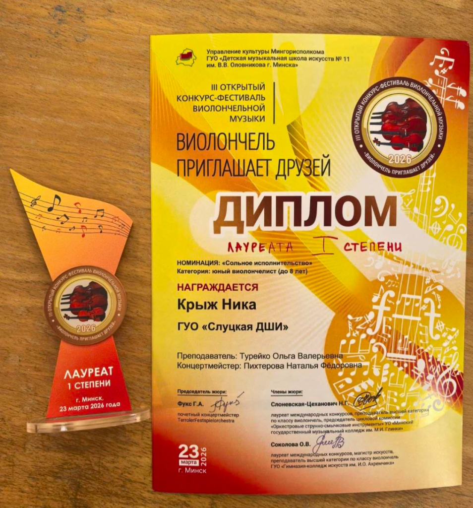 Дипломом лауреата I степени III открытого конкурса-фестиваля виолончельной музыки «Виолончель приглашает друзей» награждена Крыж Ника (учитель Турейко О.В., концертмейстер Пихтерова Н.Ф.)